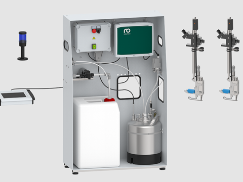 PerfectFold is mainly made up of two jetting heads, a pump, two liquid containers for changeover on the fly, and an I/P converter that controls that the correct amount of liquid is applied according to the production speed.